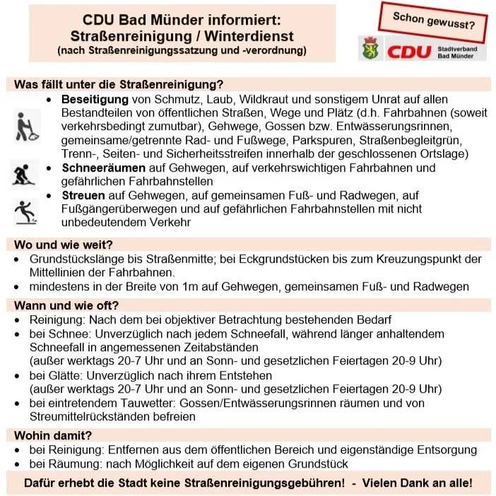 Der CDU-Stadtverband Bad Münder und die CDU-Fraktion sind als wesentliche, gestaltende Kräfte aus der Politik unserer Stadt und unserer Ortsteile nicht wegzudenken. Wir begleiten nicht nur die tagesaktuellen politischen Themen Bad Münders und seiner Ortsteile, sondern wir geben wesentliche Impulse und engagieren uns mit voller Kraft für unsere Heimatstadt.